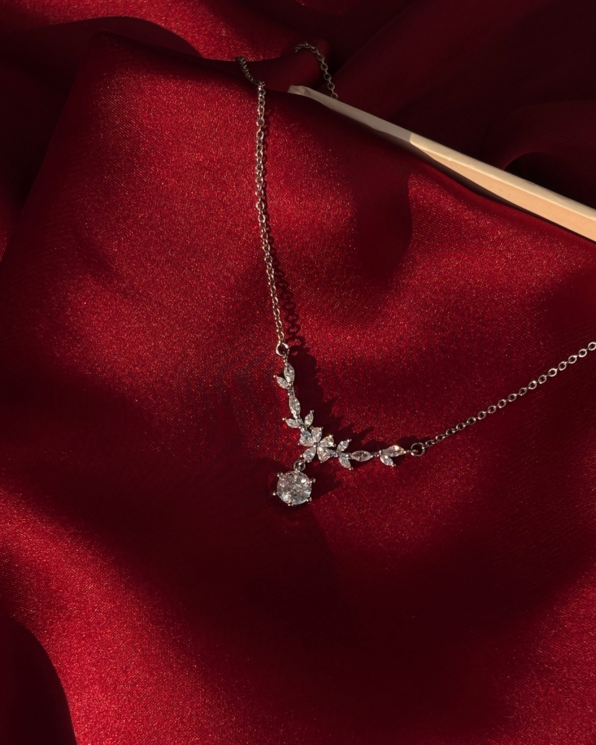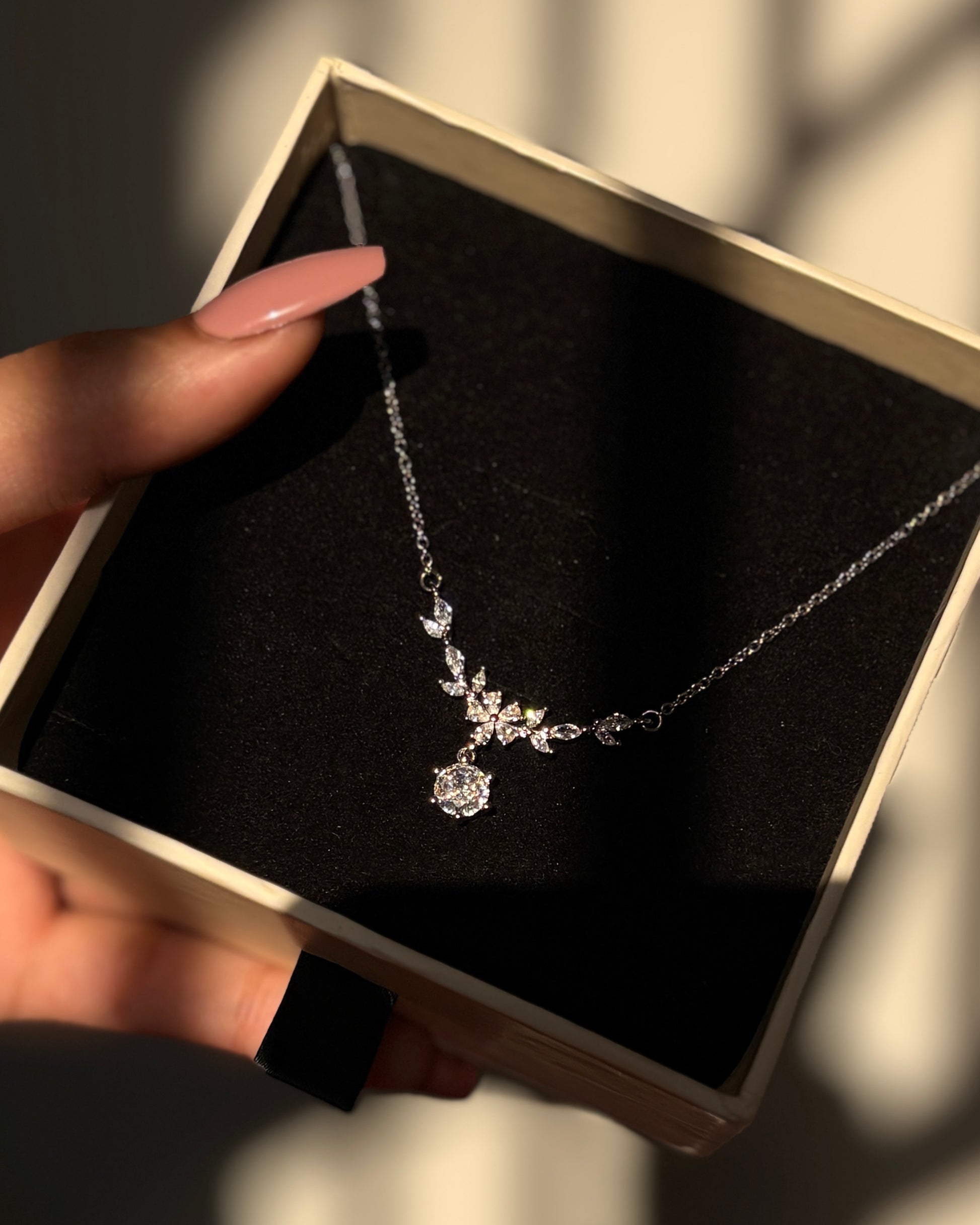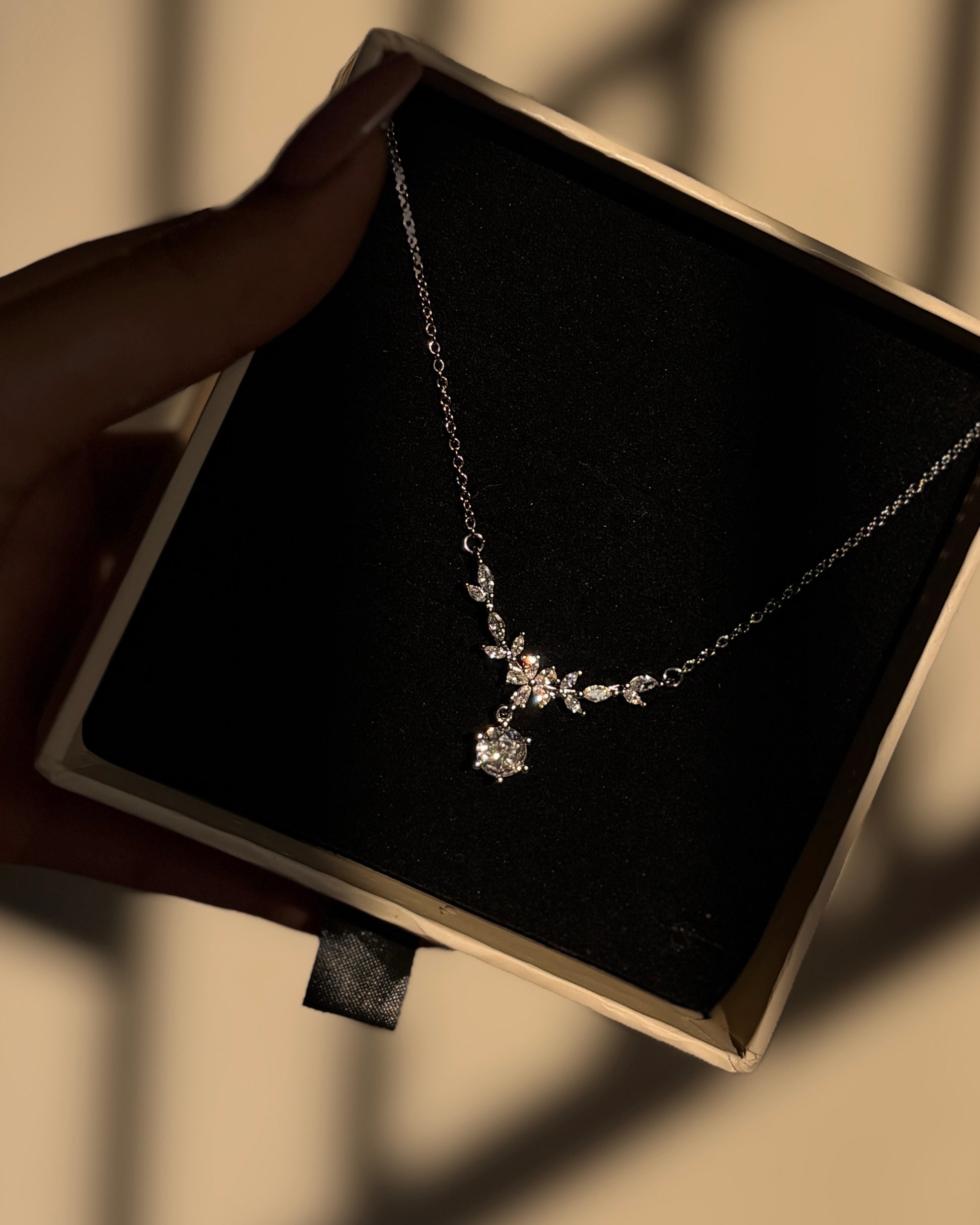 This necklace is designed around balance and movement. Its leaf-inspired setting follows a natural, graduated flow, allowing each stone to catch light without overwhelming the design. The result is a soft, refined shimmer that feels intentional rather than loud.